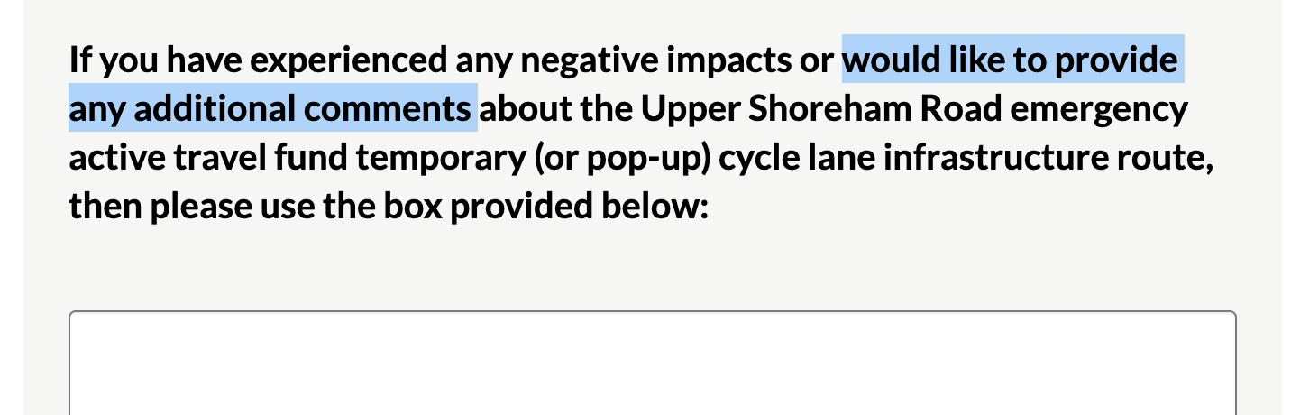 Near the end comes an invitation to “provide any additional comments“. Here’s where you can share anything else that’s on your mind. You might want to mention the difference that the cycle lanes are making to you, and your family.